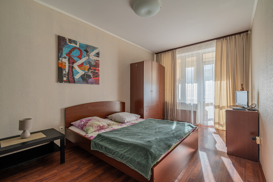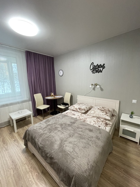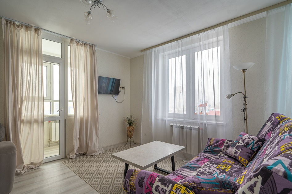 17 этаж, вид на город. Мини-кухня, двуспальная кровать, диван, Smart TV, лоджия.