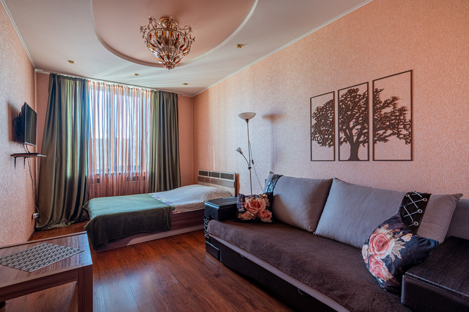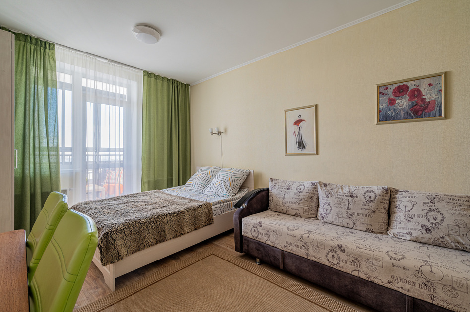 Студия в новом ЖК «Студия Парк», вид на город с 20 этажа. Двуспальная кровать и диван.